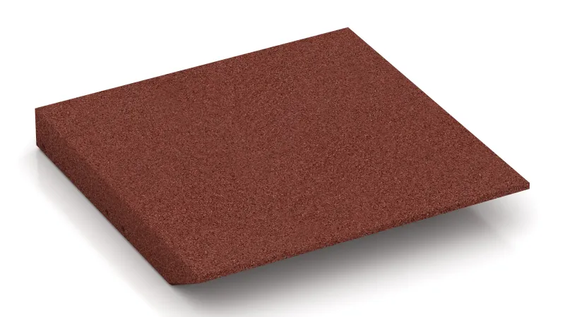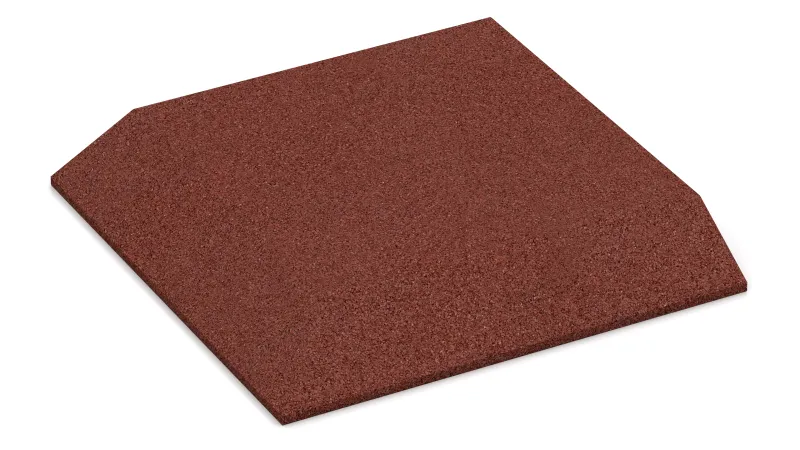 The corner tile with two chamfered sides arranged perpendicularly to each other is a useful and system-compatible addition to the rubber granulate tiles type FS. The corner tile is used between two perpendicularly situated edge tiles FI to build a corner without any trip hazard. Edge tiles and corner tiles are used if only a section of the ground should be covered with rubber granulate plates. Usage of the corner tile helps smoothly compensate the level difference between the ground and the rubber slabs surface. That's how the danger of accident can be reduced.