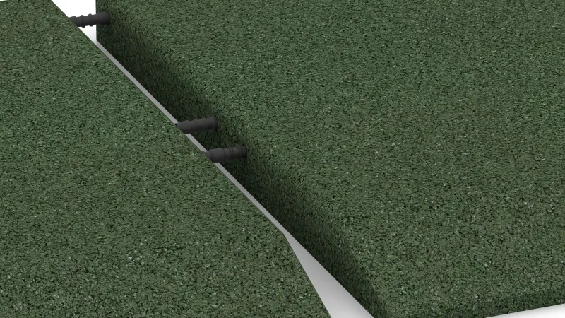 The corner tile with two chamfered sides arranged perpendicularly to each other is a useful and system-compatible addition to the rubber granulate tiles type FS. The corner tile is used between two perpendicularly situated edge tiles FI to build a corner without any trip hazard. Edge tiles and corner tiles are used if only a section of the ground should be covered with rubber granulate plates. Usage of the corner tile helps smoothly compensate the level difference between the ground and the rubber slabs surface. That's how the danger of accident can be reduced.