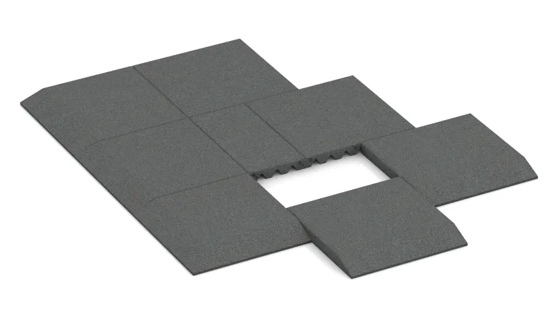 The corner tile with two chamfered sides arranged perpendicularly to each other is a useful and system-compatible addition to the rubber granulate tiles type FS. The corner tile is used between two perpendicularly situated edge tiles FI to build a corner without any trip hazard. Edge tiles and corner tiles are used if only a section of the ground should be covered with rubber granulate plates. Usage of the corner tile helps smoothly compensate the level difference between the ground and the rubber slabs surface. That's how the danger of accident can be reduced.