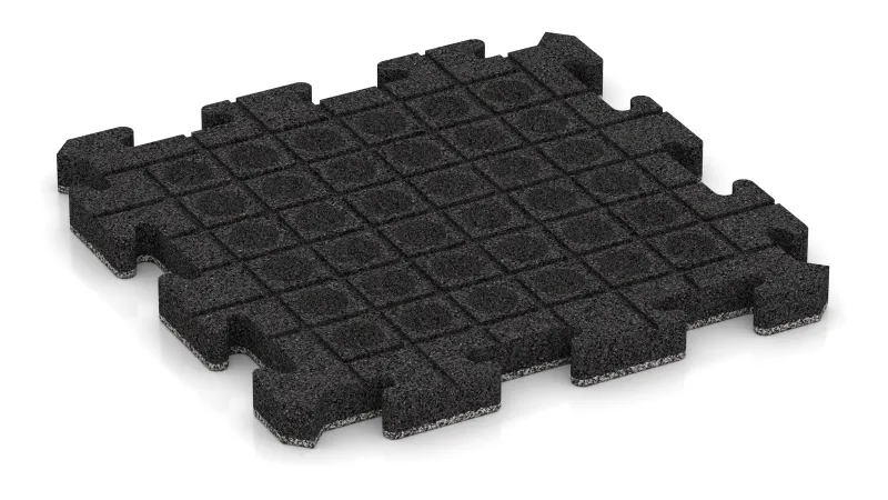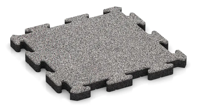 The tile base is PU-bonded ELT rubber granulate. As an option, the surface can be finished with a coloured EPDM wear layer that is through-dyed, UV-stable and extremely durable. EPDM is free from harmful substances and even meets the strict standards for baby toys – making it completely safe in direct skin or paw contact.