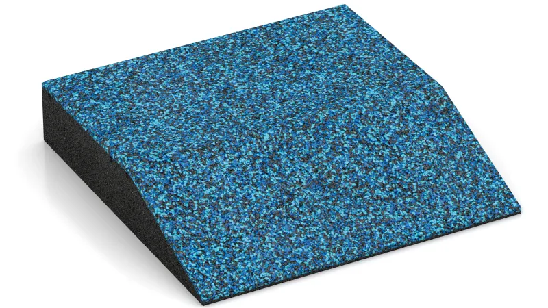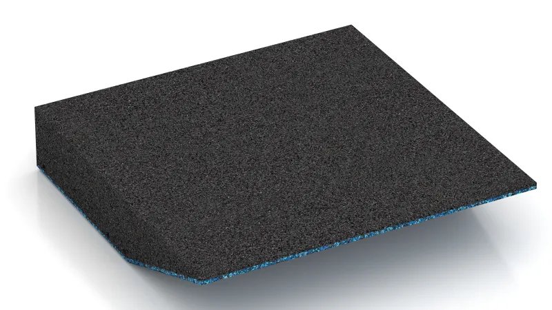 The edge tile with one chamfered side is a useful and system-compatible addition to the rubber granulate tiles type FS. The edge tile is used for avoiding trip hazard that can occur at the transition to the rubber granulate surface in case only one section is paved with rubber granulate slabs. It also helps compensate the level difference between the ground and rubber plates surface. Trip accidents can be avoided and smooth driving on it with a wheelchair, a baby buggy or a rollator is possible.