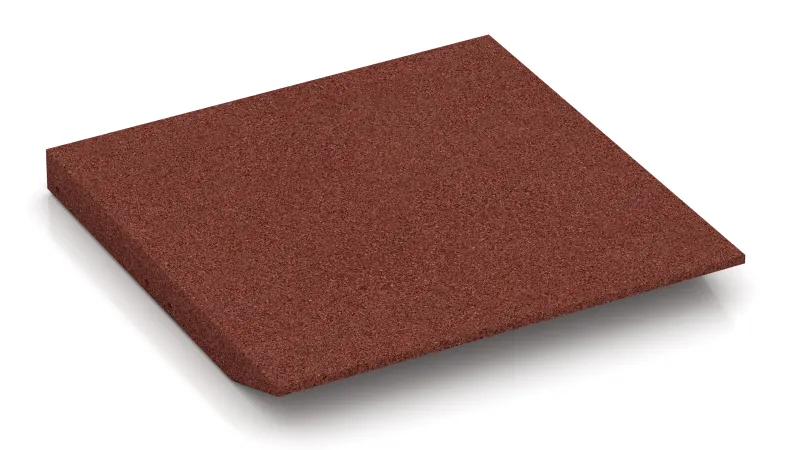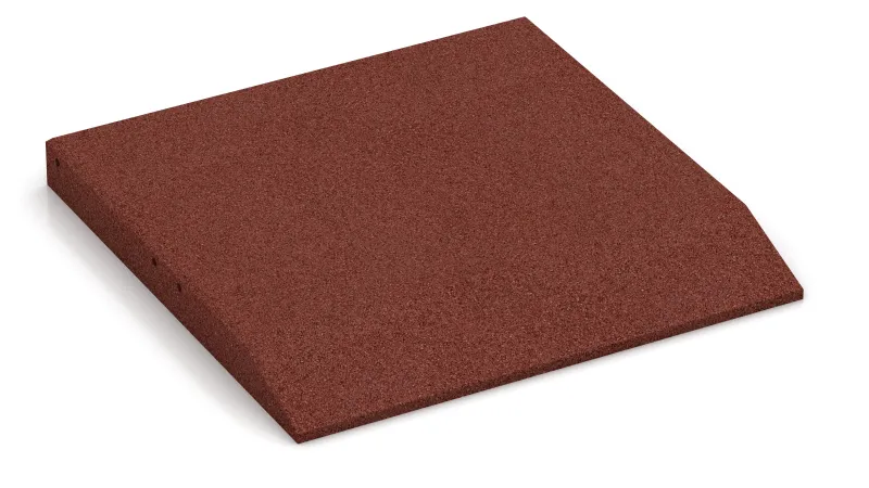 The edge tile with one chamfered side is a useful and system-compatible addition to the rubber granulate tiles type FS. The edge tile is used for avoiding trip hazard that can occur at the transition to the rubber granulate surface in case only one section is paved with rubber granulate slabs. It also helps compensate the level difference between the ground and rubber plates surface. Trip accidents can be avoided and smooth driving on it with a wheelchair, a baby buggy or a rollator is possible.