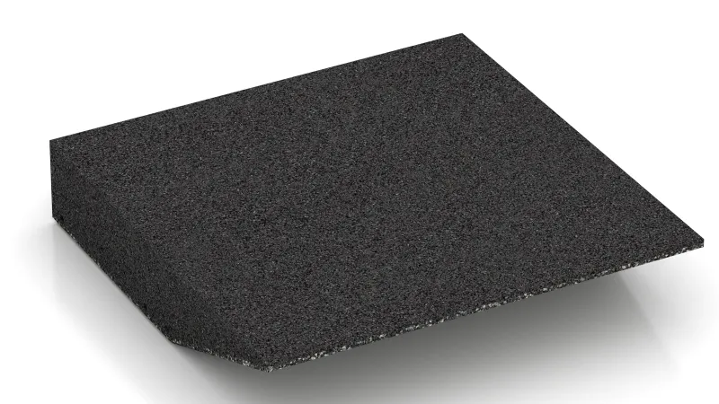 The edge tile with one chamfered side is a useful and system-compatible addition to the rubber granulate tiles type FS. The edge tile is used for avoiding trip hazard that can occur at the transition to the rubber granulate surface in case only one section is paved with rubber granulate slabs. It also helps compensate the level difference between the ground and rubber plates surface. Trip accidents can be avoided and smooth driving on it with a wheelchair, a baby buggy or a rollator is possible.