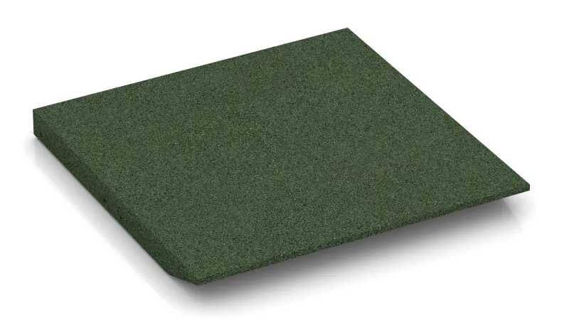 The edge tile with one chamfered side is a useful and system-compatible addition to the rubber granulate tiles type FS. The edge tile is used for avoiding trip hazard that can occur at the transition to the rubber granulate surface in case only one section is paved with rubber granulate slabs. It also helps compensate the level difference between the ground and rubber plates surface. Trip accidents can be avoided and smooth driving on it with a wheelchair, a baby buggy or a rollator is possible.