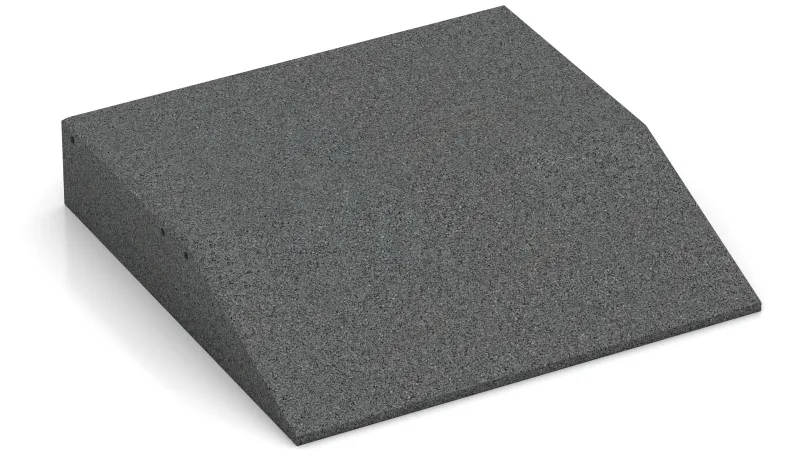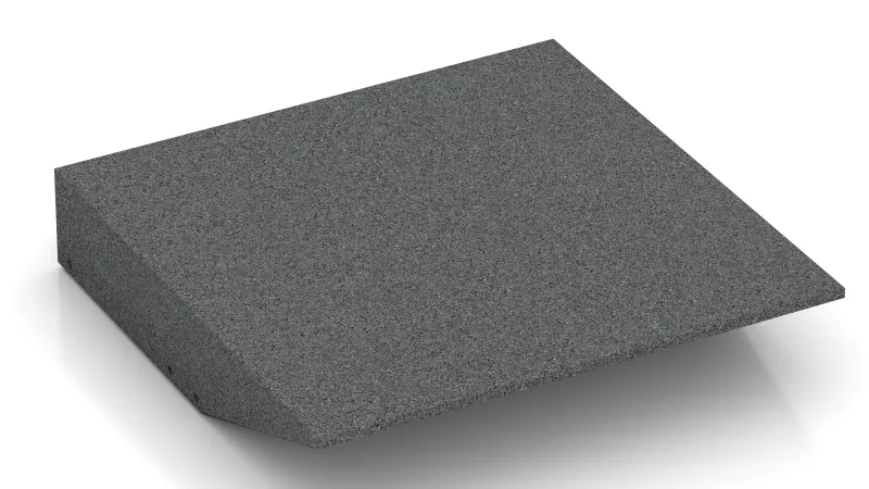 The edge tile with one chamfered side is a useful and system-compatible addition to the rubber granulate tiles type FS. The edge tile is used for avoiding trip hazard that can occur at the transition to the rubber granulate surface in case only one section is paved with rubber granulate slabs. It also helps compensate the level difference between the ground and rubber plates surface. Trip accidents can be avoided and smooth driving on it with a wheelchair, a baby buggy or a rollator is possible.