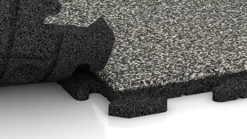 In this system, the tile edges feature an interlocking profile reminiscent of classic jigsaw teeth or mushroom-shaped connectors. During installation, the profiles of adjacent tiles interlock to form a continuous connection across the full tile thickness.