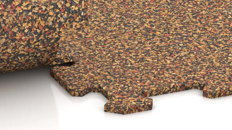 The tiles are produced by moulding oversized slabs from PU-bonded ELT rubber granulate. After a curing and cooling phase, these slabs are split in half to create thinner elements. The result is exceptionally thin fitness tiles with a typical rubber surface that appears almost closed, preventing dirt and moisture from penetrating.