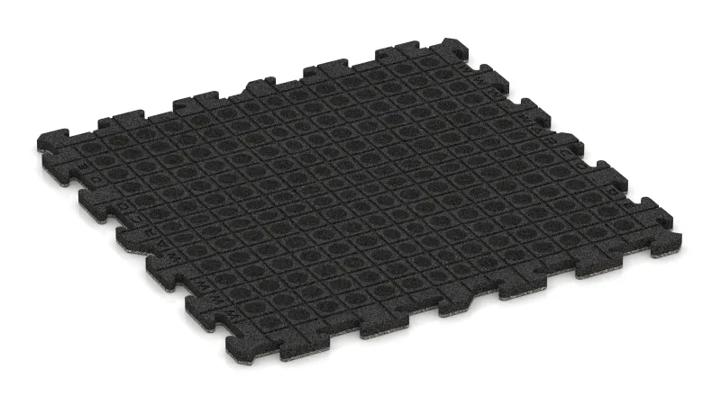 Two tile edges feature a positive locking profile, the other two a matching negative profile. When laid, the tiles interlock securely from below, forming a durable mechanical connection. From above, the surface appears seamless and aligned, typically with a clean, square joint pattern similar to a chessboard layout.