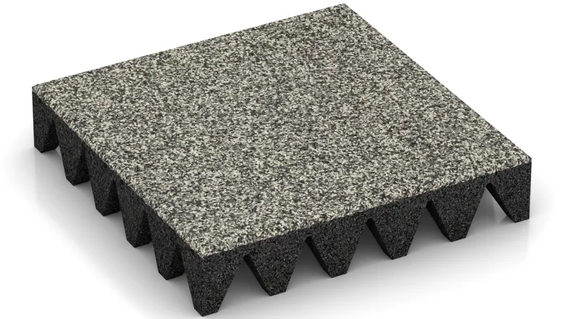 The underside is shaped with a uniform pattern of inverted pyramid stubs. This structure supports shock absorption and allows water to drain horizontally. Rainwater passes through the tile and flows underneath along the surface slope. Waterlogging is avoided.