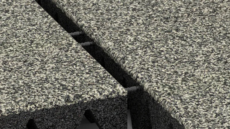 For outdoor installations, WARCO recommends a long-term stable, water-permeable base layer. Proven options include plastic ground reinforcement grids (gravel stabilisation panels) or an existing bound and porous sub-base such as porous concrete. If the base is not permeable, exposed surfaces must include a drainage gradient of at least 1.5 %. Installation on loose materials like sand, gravel or crushed stone is not recommended, as these tend to shift under resilient rubber tiles.