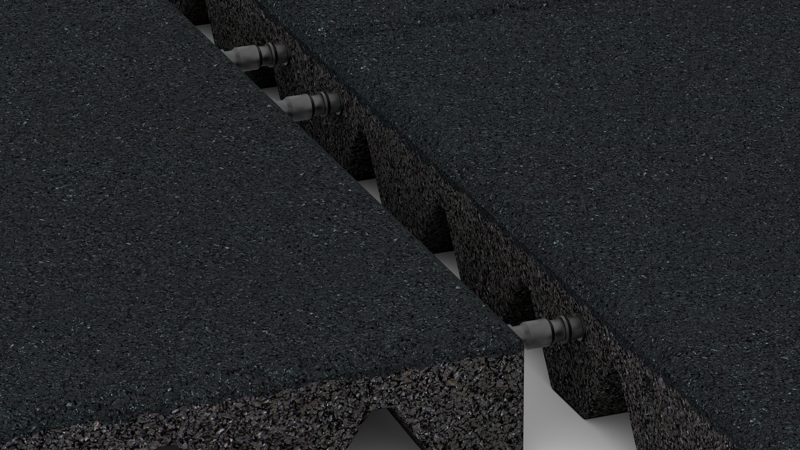 For outdoor installations, WARCO recommends a long-term stable, water-permeable base layer. Proven options include plastic ground reinforcement grids (gravel stabilisation panels) or an existing bound and porous sub-base such as porous concrete. If the base is not permeable, exposed surfaces must include a drainage gradient of at least 1.5 %. Installation on loose materials like sand, gravel or crushed stone is not recommended, as these tend to shift under resilient rubber tiles.