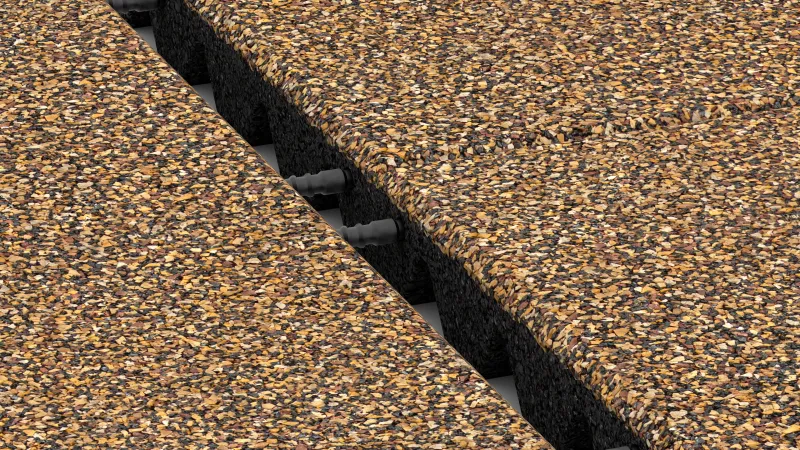 For outdoor installations, WARCO recommends a long-term stable, water-permeable base layer. Proven options include plastic ground reinforcement grids (gravel stabilisation panels) or an existing bound and porous sub-base such as porous concrete. If the base is not permeable, exposed surfaces must include a drainage gradient of at least 1.5 %. Installation on loose materials like sand, gravel or crushed stone is not recommended, as these tend to shift under resilient rubber tiles.