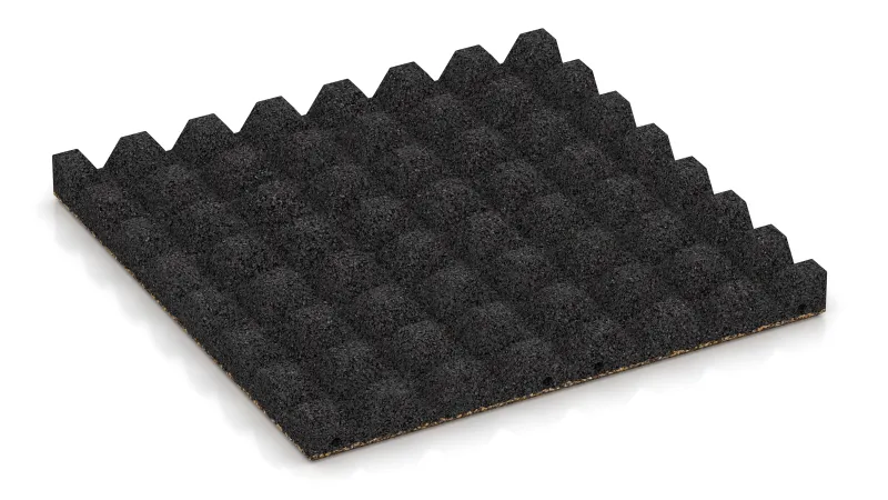 The open-pored surface made of coloured EPDM granules is UV-stable, abrasion-resistant and slip-resistant – even on wet ground. Thanks to its pleasant texture, the tile is ideal for barefoot or seated use. The underside is made of profiled ELT granulate with inverted pyramid shapes that provide impact absorption, promote drainage and allow the surface to dry quickly.