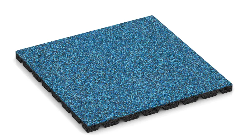 The tiles are made of PU-bonded rubber granulate with an elastic, slip-resistant surface. Thickness and density determine the level of shock absorption and the certified fall height according to EN 1177. The 50 × 50 cm format minimises cutting waste, and individual tiles can be replaced quickly if required.