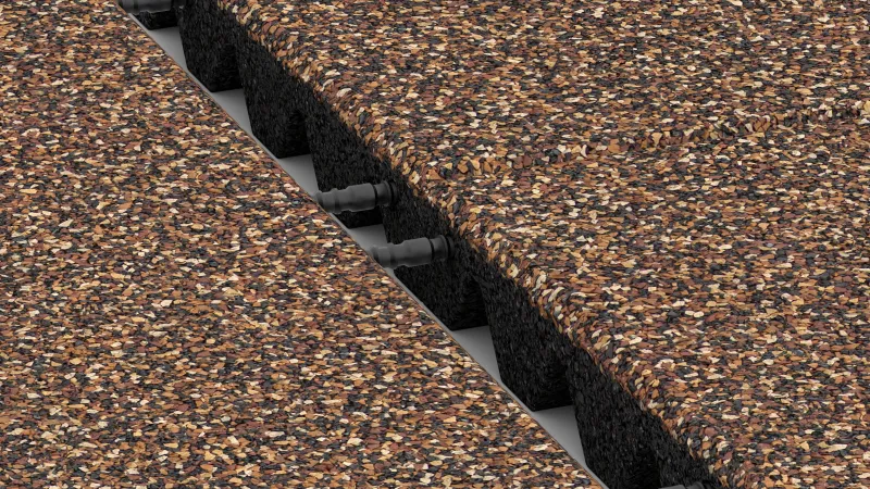 For outdoor installations, WARCO recommends a long-term stable, water-permeable base layer. Proven options include plastic ground reinforcement grids (gravel stabilisation panels) or an existing bound and porous sub-base such as porous concrete. If the base is not permeable, exposed surfaces must include a drainage gradient of at least 1.5 %. Installation on loose materials like sand, gravel or crushed stone is not recommended, as these tend to shift under resilient rubber tiles.
