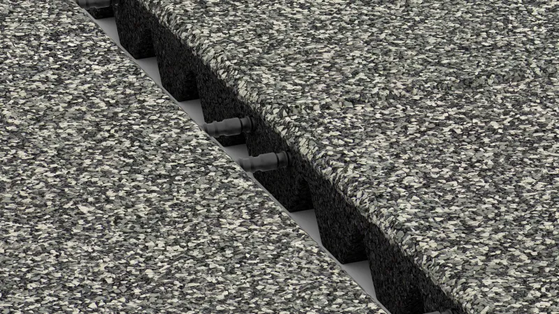 For outdoor installations, WARCO recommends a long-term stable, water-permeable base layer. Proven options include plastic ground reinforcement grids (gravel stabilisation panels) or an existing bound and porous sub-base such as porous concrete. If the base is not permeable, exposed surfaces must include a drainage gradient of at least 1.5 %. Installation on loose materials like sand, gravel or crushed stone is not recommended, as these tend to shift under resilient rubber tiles.