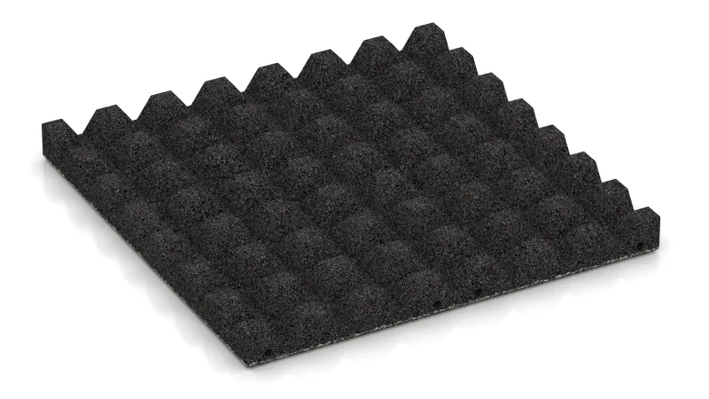 The tiles are made of PU-bonded rubber granulate with an elastic, slip-resistant surface. Thickness and density determine the level of shock absorption and the certified fall height according to EN 1177. The 50 × 50 cm format minimises cutting waste, and individual tiles can be replaced quickly if required.