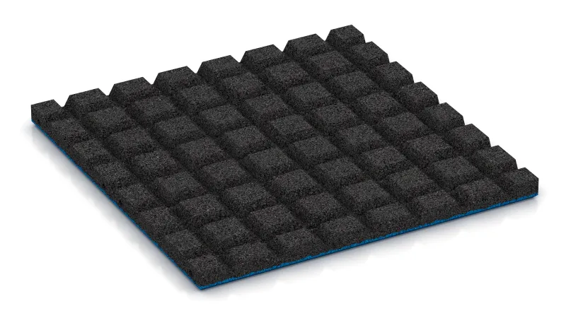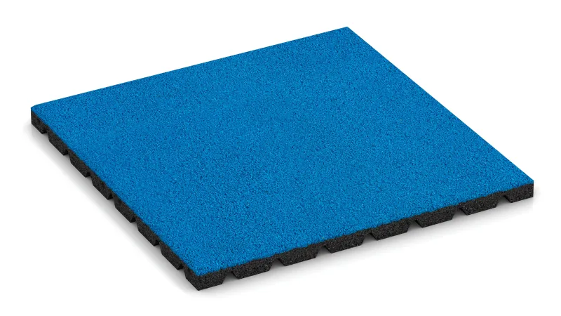 The tiles are made of PU-bonded rubber granulate with an elastic, slip-resistant surface. Thickness and density determine the level of shock absorption and the certified fall height according to EN 1177. The 50 × 50 cm format minimises cutting waste, and individual tiles can be replaced quickly if required.