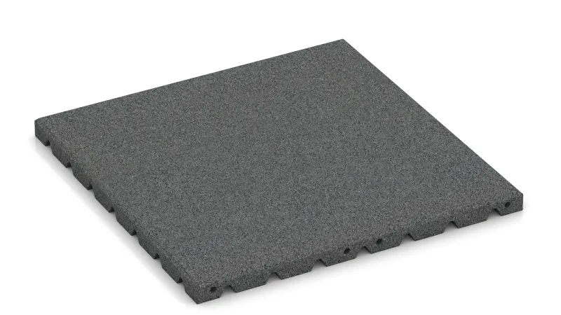 The tiles are made of PU-bonded rubber granulate with an elastic, slip-resistant surface. Thickness and density determine the level of shock absorption and the certified fall height according to EN 1177. The 50 × 50 cm format minimises cutting waste, and individual tiles can be replaced quickly if required.
